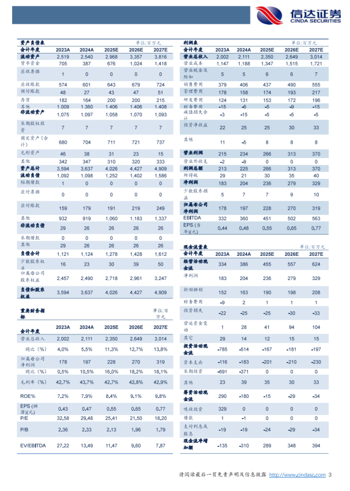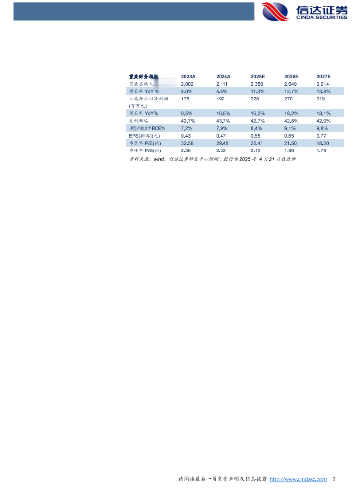 盈利预测:我们预计公司2025-2027年营业收入分别为23.50、26.49、30.14亿元,同比增速分别为11.3%、12.7%、13.8%,实现归母净利润为2.28、2.70、3.19亿元,同比分别增长16.0%、18.2%、18.1%,对应2025年4月21日收盘价,PE分别为25、22、18倍。