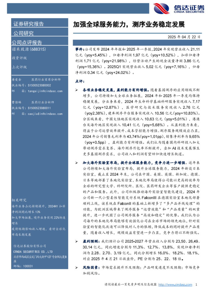 本文来自信达证券研发中心2025年4月22日发布的《诺禾致源2024年年报点评报告-加强全球服务能力,测序业务稳定发展》,欲了解具体内容,请阅读报告原文,唐爱金S1500523080002,曹佳琳S1500523080011